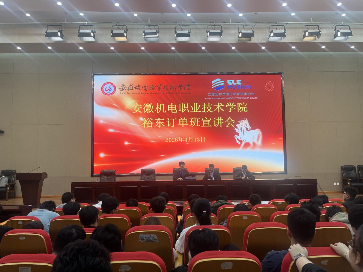 为深化产教融合、校企合作,精准对接企业人才需求,为学生搭建优质就业与成长平台,2026年4月13日,芜湖裕东自动化科技有限公司订单班宣讲会在安徽机电职业技术学院顺利举行。芜湖袋王机械销售有限公司总经理陈荣、芜湖裕东自动化科技有限公司工程师刘欢、袋王机械(上海)有限公司总经理卢晓峰和经理陈兰一行莅临现场,与学院师生深入交流。机械工程学院副院长崔强、产业学院秘书于耀庭、智能制造装备技术教研室副主任杜文文、机械基础教研室副主任柳砚、辅导员宋粲璨及相关专业教师参加了本次宣讲会。