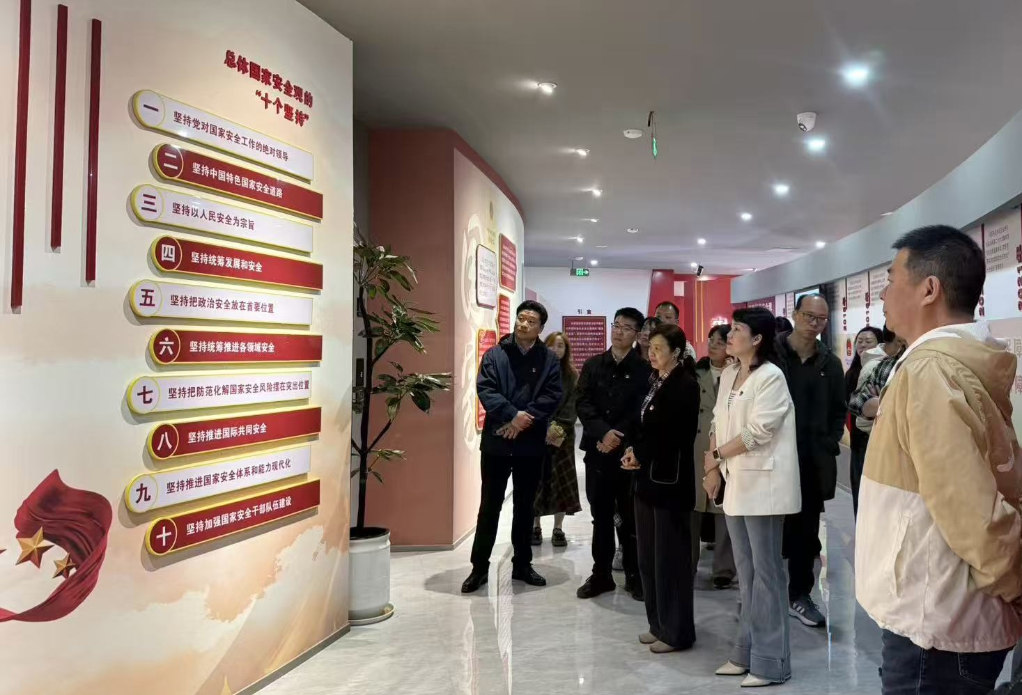 芜湖市总体国家安全观教育展馆以总体国家安全观为核心主题,立足隐蔽战线光荣历史和地方实践,融合芜湖本地红色文化资源,设置前厅、安邦定国、光辉历史、利剑出鞘、警钟长鸣、共筑长城等多个主题展区。全体党员在讲解员的引导下,有序参观各个展区,认真聆听讲解,不时驻足凝视、交流感悟。从国家安全的历史演进到新时代国家安全的重大成就,从典型正面案例的示范引领到反面警示案例的深刻剖析,从隐蔽战线的默默坚守到全民参与的共筑防线,每一处展陈、每一段故事都让全体党员深受触动,让党员们直观感受到维护国家安全的重要性与紧迫性。