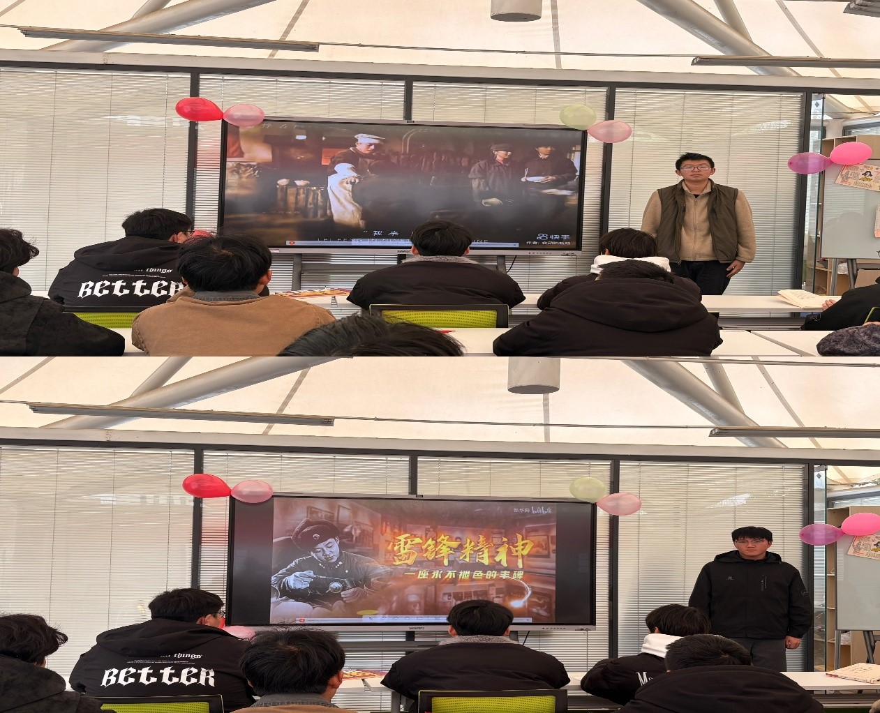 随后,飞机3251班的朱夕洋和唐兆宇同学依次上台,以视频形式分享了自己对雷锋精神的理解和感悟。他们结合学习与生活实际,诠释了新时代雷锋精神所蕴含的“奉献、友爱、互助、进步”的深刻内涵,展现了青年学子对雷锋精神的传承与践行,赢得现场阵阵掌声。