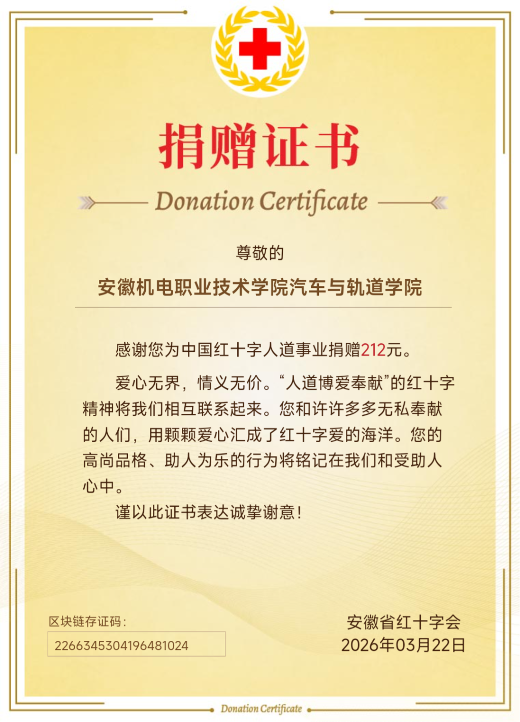 为深入践行立德树人根本任务,传承弘扬雷锋精神,将环保教育、爱心育人与雷锋精神传承相结合。汽车与轨道学院青年先锋队带领全院青年,开展了第三期“废品回收,爱心助学”主题活动。本期活动持续半年,最终将回收废品所得的212元善款,全部捐赠给中国红十字基金会,以实际行动践行雷锋精神,书写青春担当。
