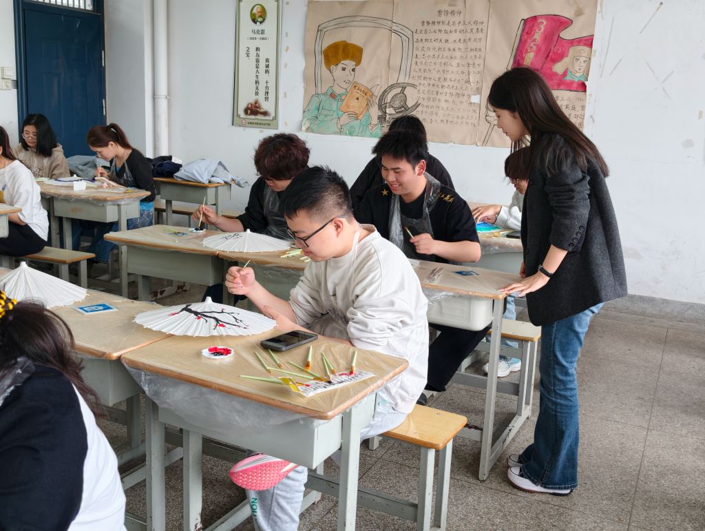 进入涂鸦创作环节,同学们手执画笔,素白伞面渐次绽放出梅花的风骨、翠竹的清逸,传统吉祥图案与现代审美巧妙融合,一柄柄油纸伞成为流动的文化符号。大家相互交流、切磋技艺,现场欢声笑语不断。