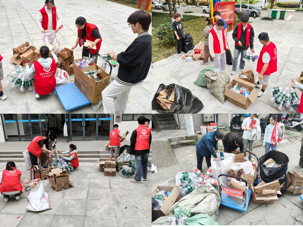 活动现场,志愿者们分工明确、干劲十足,带着工具有序开展回收工作,收集同学们积攒的废旧书本、纸箱、塑料瓶等可回收物,随后在指定区域进行细致分类、拆解打包,将零散废品整理得井然有序,每一个环节都严谨细致,充分展现了青年学子的公益热情与责任担当。